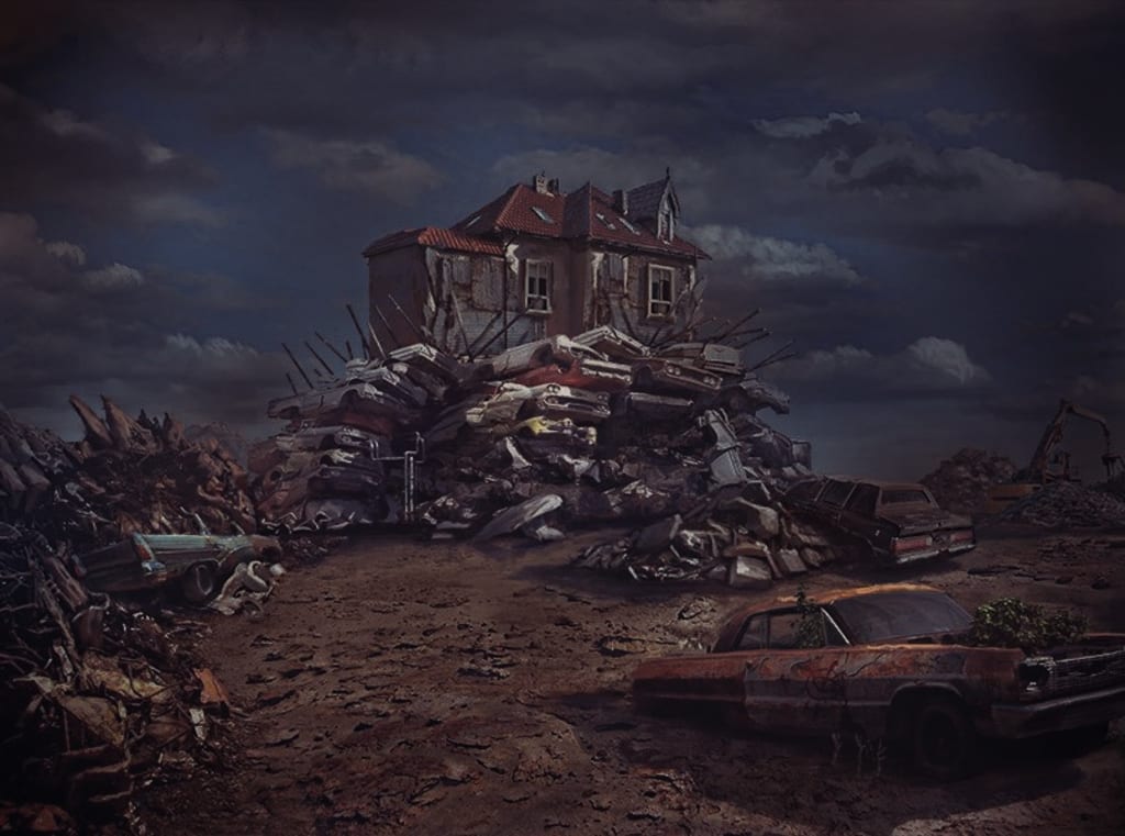 She crumpled down at the base of one of the tallest towers of trash and slowly looked to her left. Hayward lay there. Still and silent. His arm was bent in an inhuman way, but it was pointing upwards.