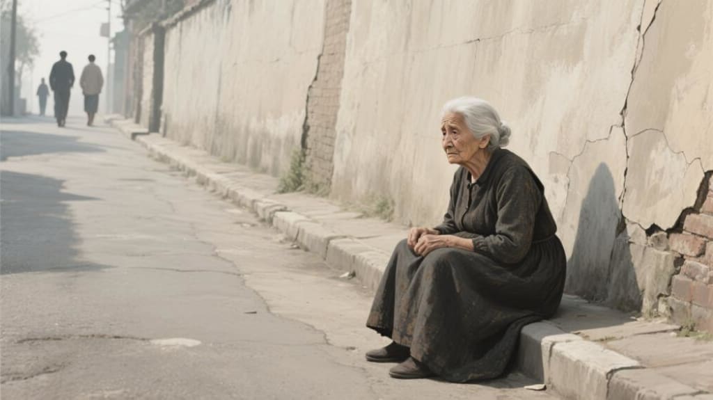 Under the vast, indifferent sky, an old lady sat by the roadside, her gnarled hands resting on a weathered cane. Her eyes, clouded with age yet sharp with intuition, were fixed on a towering wall nearby. It was an ancient structure, its bricks weather-beaten and cracked, leaning precariously as if a mere whisper could bring it down. Every time she gazed at it, a strange, insistent feeling welled up in her heart—the wall seemed as if it would collapse at any moment.