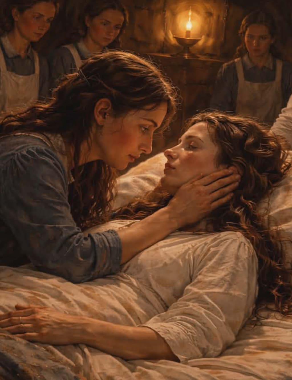 A dozen women were already there, all brethren, standing like a still pasture, blue dresses and white aprons, sleeves rolled from the chores already completed before sunrise. The garments were all the same — one pattern, one fabric, hand-stitched. Together they formed a single breathing body around the bed.