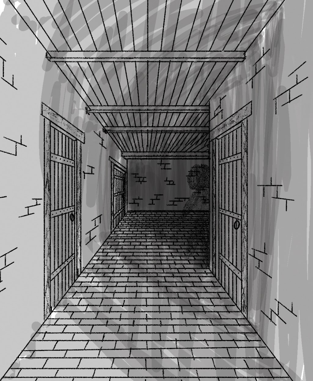 Just as the shadows were about to touch her the door above her splinters into pieces Brann slamming His axe into it. “Luxantra” The song of Liora sounding more like a battle cry, rings through the short hallway followed by a bright blue flash of light shoving the shadows back to the corner they come from.