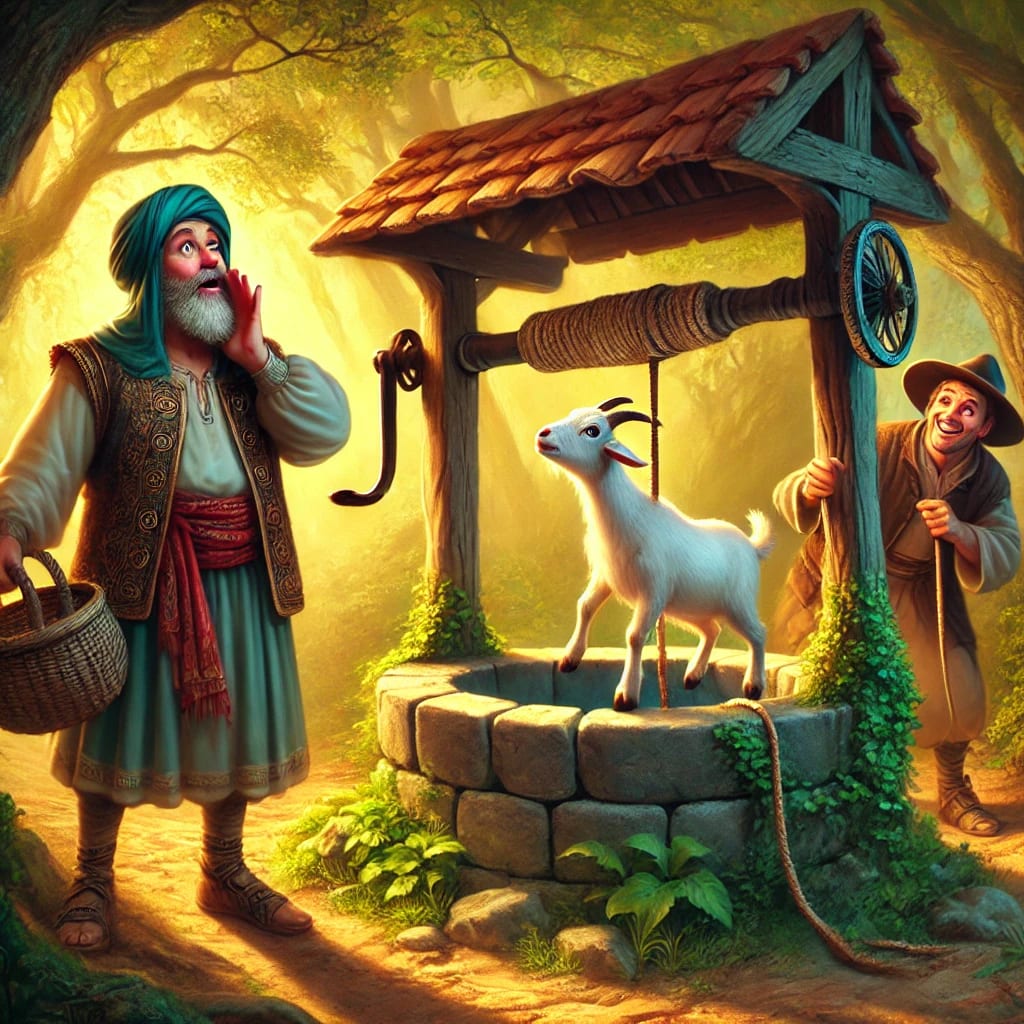 He quickly grabbed a rope and a pot and hurried to the well. Just as he lowered the rope, he heard the bleating of a goat from inside the well. Surprised, he peered in and saw a goat standing kneedeep in water, looking up and bleating for help.