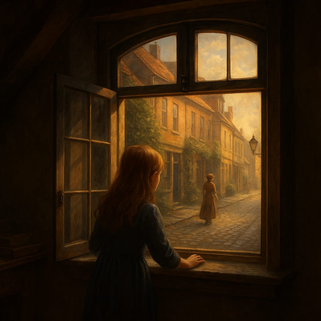 Back in the attic, the latch clicked once more. The window opened with a long breath, as if waking. A breeze swept through the room, carrying the faint scent of cobblestone and roses. And then, softly, Talia stepped back inside — her feet dusty, her heart full. Behind her, Elsie faded like morning mist, smiling.