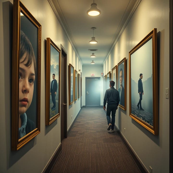 To my left, the hallway waited lined with frames that flickered. In one, a child’s face peered at me. In another, a man stepped backward into fog. The photos didn’t stay still. They shifted when I looked away.