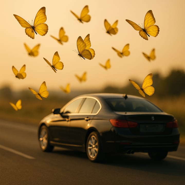 A flurry of golden monarchs rose from the roadside and spiraled into the air.