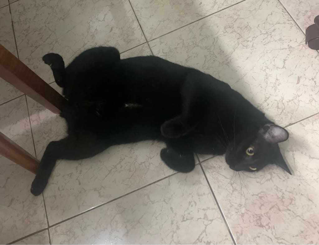 Another time, he dragged in a blue cushion, scavenged from somewhere, with a tiny pillow embroidered with a black cat. He set it near his bed.