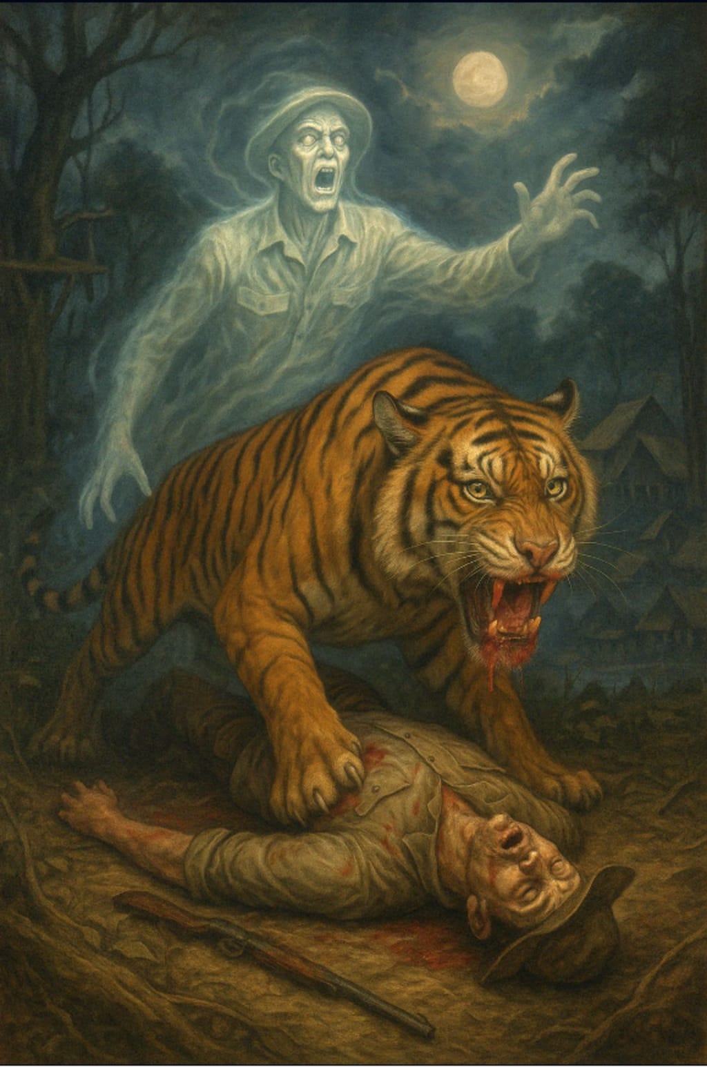 But in the silence, a huge tiger had come out of the dark. Scenting fresh blood, it rushed in and maliciously tore the flesh off of the hunter with the wild beast's instinct.