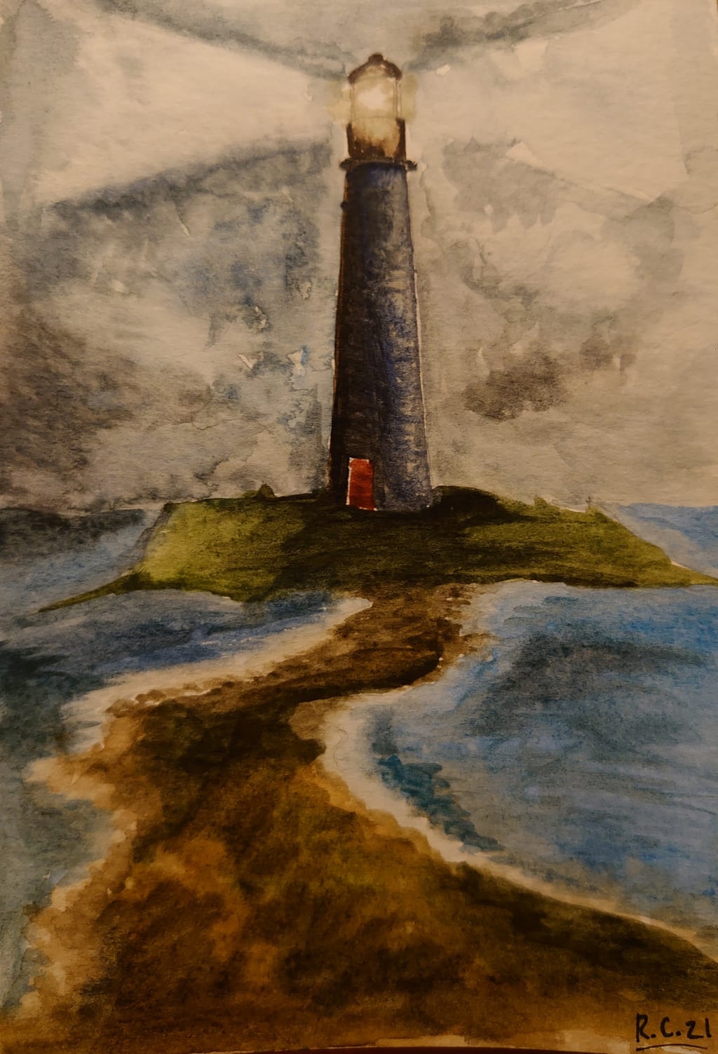 It was her habit of an evening to climb the steps of the lighthouse tower. From its observation deck she would look out across the sea. No one knew what she thought about, or where her mind would wander, but one evening, as lightning danced upon the darkening horizon, she cast her eyes down to the beach. There she saw him, the boy she loved, entwined in the arms of a local girl. She watched them: they rolled together in the sand and the surf, surging into and onto one another, oblivious to Lynda and her broken heart. Below the deck of the lighthouse the maw of the broiling sea churned and chewed upon itself; the rocks gleamed like ebony fangs, masticating satanically.