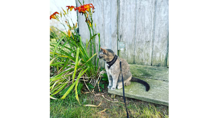 "Oh, what a beautiful kitten you are! I love her markings, the gray, the white, and the golden patches. She's a little tortoiseshell!" The other voice said. "I haven't seen a color pattern like hers before. Usually, they're black and gold patches?" Little One looked up into the face of the person holding her. The brown hair reflected kindly under the afternoon sun, her deep brown eyes full of kindness and love. Little One looked around at her new surroundings. They were on a gray stone patio, surrounded by lush green grass and a colorful garden. It was at the edge of this where Little One saw something familiar, something from home. She squirmed and squealed with excitement until the Girl placed her gently on the ground. Little One raced over to the bright-colored marigolds and batted at them playfully.