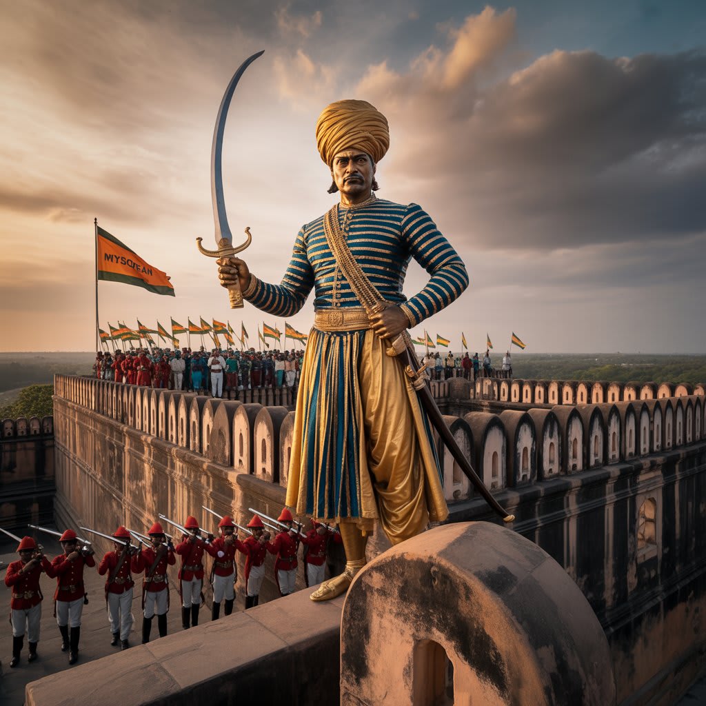 Born in 1751 in Devanahalli, near modern-day Bengaluru, Tipu was destined for greatness. His father, Hyder Ali, was a brilliant military commander who rose through the ranks to become the Sultan of Mysore, forging a formidable kingdom that rivaled the might of European colonizers. Tipu was trained from a young age in warfare, politics, languages, and science. He spoke Persian, Arabic, Kannada, and French, and studied military tactics from both Islamic and Western texts. He was not only a warrior but a visionary — a ruler who understood that the age of muskets and strategy had dawned.