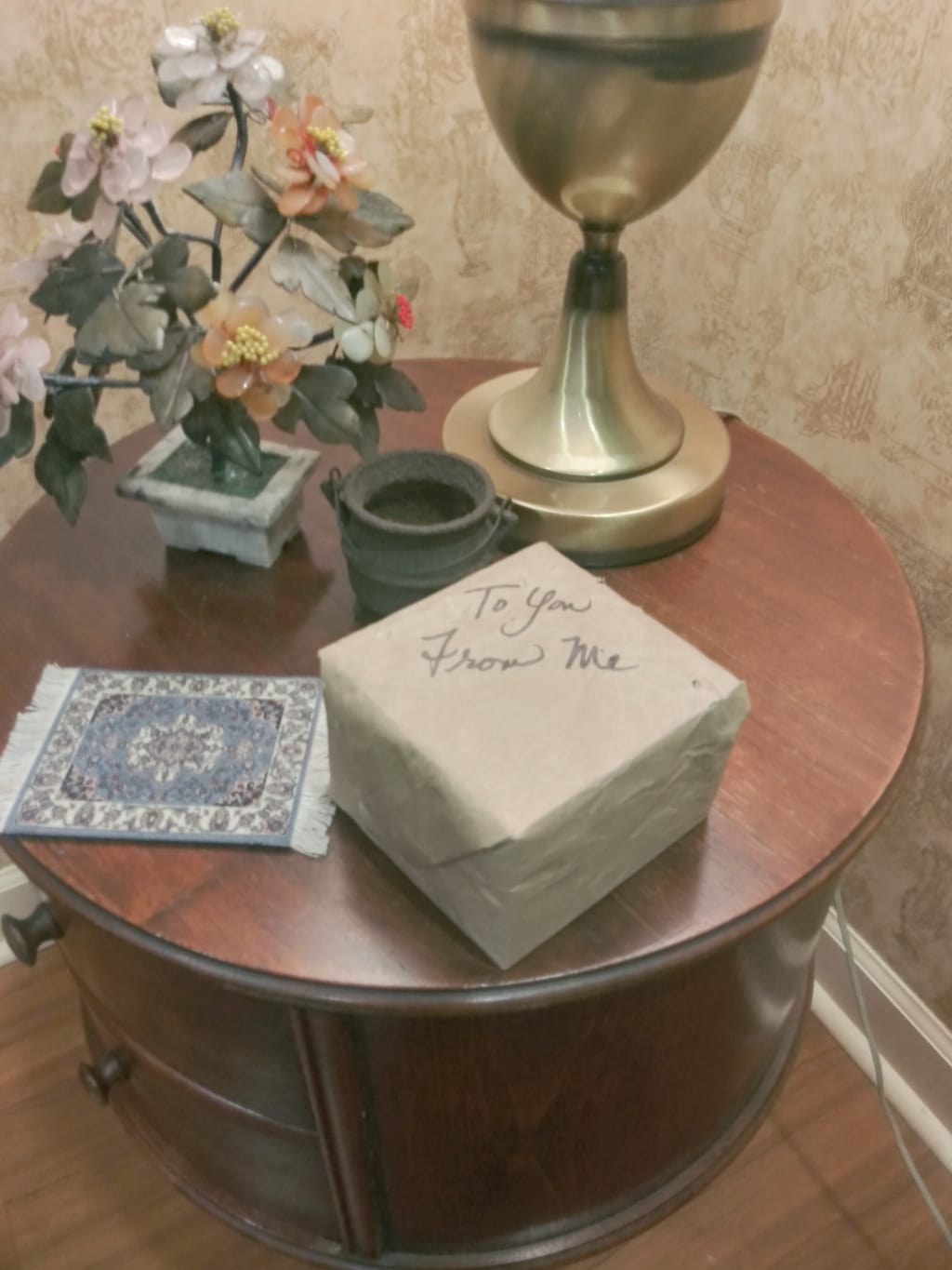 The brown paper package showed only one label. It read “To you, From me” hand written in beautiful cursive. The paper was crinkled and slightly torn in some spots. The mysterious box must have been in the hole in the wall for almost 3 years. Ida cried as she held it to her heart, knowing Harold had put it there, and had never ruined the surprise. All these years, she had missed him. This little present was like having a part of him here with her again. She couldn't bring herself to open it. She sat it on her nightstand and went to the closet to get Harold’s work shirt. It barely smelled like him anymore but she could never bring herself to wash it. She laid his shirt on his pillow and turned out the light.