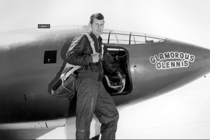 The simplest method for producing sufficient thrust was to use a rocket engine, but due to its enormous fuel consumption, such an aircraft would need to be launched from a mothership at an altitude in order to avoid the fuel-consuming process of taking off and ascending to heights. The Bell X-1 had a small straight wing and a shape similar to a.50-caliber bullet. On 14 October 1947, test pilot Charles ‘Chuck’ Yeager (pictured) flew the X-1, nicknamed Glamorous Glennis for his wife, launched from a B-29 ‘mothership’ and achieved a speed of Mach 1.06. In controlled, level flight, the Bell X-1 was the first aircraft to break the so-called "sound barrier."