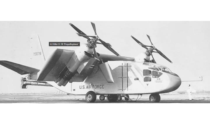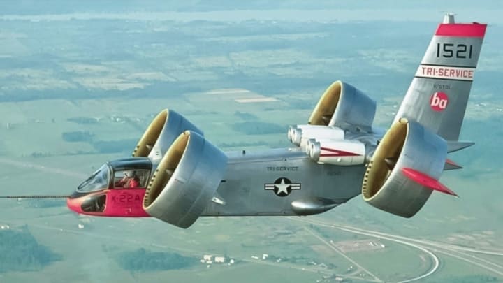 One way to affect vertical flight is to rotate the entire wing, including its engines, 45 degrees, a concept known as a ‘tilt wing’. Numerous components, including its massive coupled turbofan engines, were taken from a failed VTOL fighter project in order to save money. The pitch was controlled by a Westinghouse J34 jet engine.