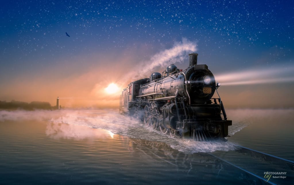 As you pass by the cabins you look in to see people from different eras sleeping in their bunks, with each cabin looking as if it was that time. Tickets, get your tickets ready brought you back to your senses only to see the shadow of the conductor coming around the corner. You took off running once again to come upon the dining car where individuals sat and talked, not from this planet anyway with each other as you walked by with each of them glancing your way as you made your way to the exit. Only to be stopped by a smooth silky hand as it took you by the arm and led you to a table. As you look out the window different colour lines flash by as if you were travelling faster than the speed of light, tickets, have your tickets ready. And there he was, the conductor, calling for tickets and just passing on by you and carrying on his way as if you weren't there at all. What is going on here? I turn to look at the individual that led me to the table and you were alone again, laying in your cabin not being able to move once again as the sky became a light hue of blue as the night was ending and the horizon brought on another day on a train to nowhere.