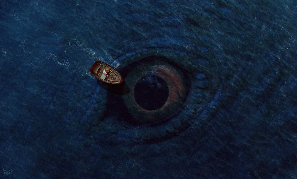 As he began to swim towards it, a massive tentacle rose into the center of the ship. Suddenly, four goliath tentacles came out of the water, two on the port side and two on the starboard, and fell on top of the Wuying! Crushing the ship, the tentacles struck the gunpowder deep below, igniting it and causing a horrendous explosion sending debris flying everywhere. A piece of wood flew into the air and finally landed in the water close to Calvin, who swam to it, and when he finally reached it, he grabbed hold of it and watched as the beautiful Wuying died beneath the waves. Then it reappeared once more, the eye surfaced out of the water and moved in so close to Calvin he could almost feel the eye pulsating with heat, feeling the ferocity of a leviathan staring him down but, it only blinked one last time and finally submerged and as Calvin looked below, he saw it staring back at him, unblinking, becoming dimmer until finally, it was no more. It had retreated to the deep below.