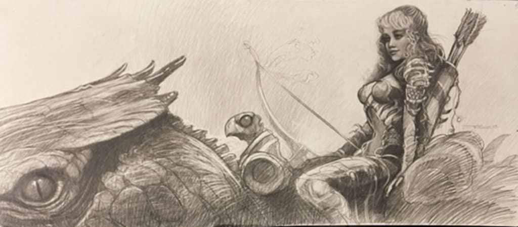 Draco had been well fed the night before. The great beast clucked a greeting as Lady DracoWing harnessed her for the coming flight. She walked Draco out of her hillside cave into the sunlight, took the leather caps off its wingtip talons, and secured her bow and arrows. Her heart began to race as she mounted Draco and grabbed the pommel of her saddle.