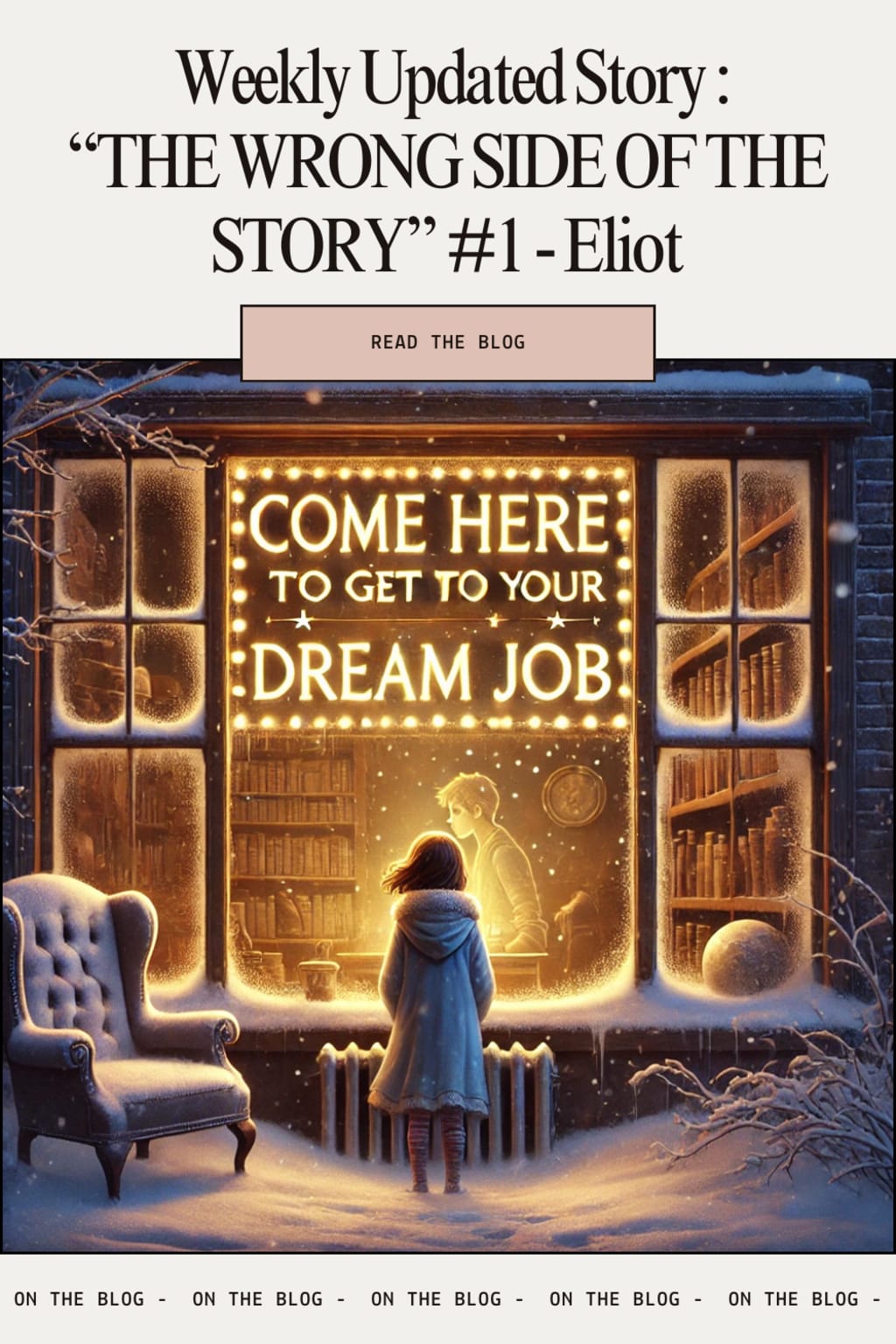 We walked together to the fish stall when I saw a poster in the window. ‘Come here to study for your dream job!’ I was excited. How could it be that I had just thought of it and that it was now hanging in front of me? My brother had walked on because it was very cold and snowing. But I couldn’t take my eyes off it. There was a man reflected in the glass. I looked at it for a while and was startled when he came closer. I didn’t move. Luckily I saw Eliot’s face smiling at me. Two birds with one stone. I started asking for the tutoring and then saw my brother turn around very quickly.
