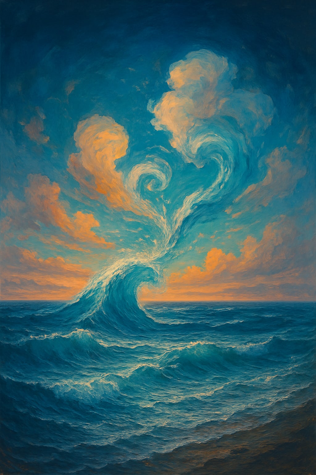 When they longed for one another, the sky sent rain, droplets falling like tears into the sea. The ocean caught every drop, holding them close, never letting go. And when joy filled them both, the sun painted the horizon with pinks and oranges, their laughter spilling across the world.
