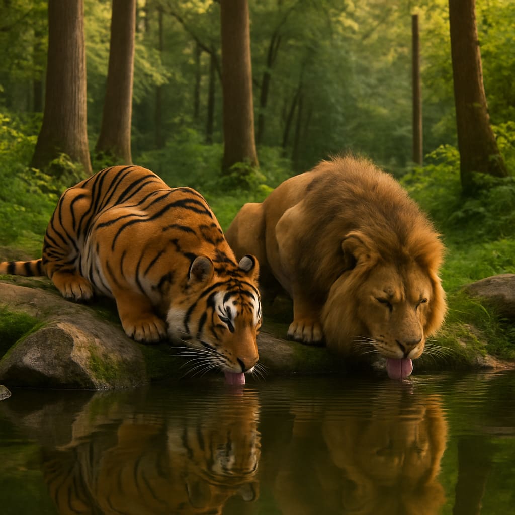 The sun filtered gently through the towering trees, painting the forest in hues of gold and green. The air was thick with the scent of moss and blooming wildflowers, and somewhere nearby, a stream trickled its way into a still, glistening lake. At the water’s edge, two magnificent beasts crouched in silence— a Bengal tiger and an African lion.