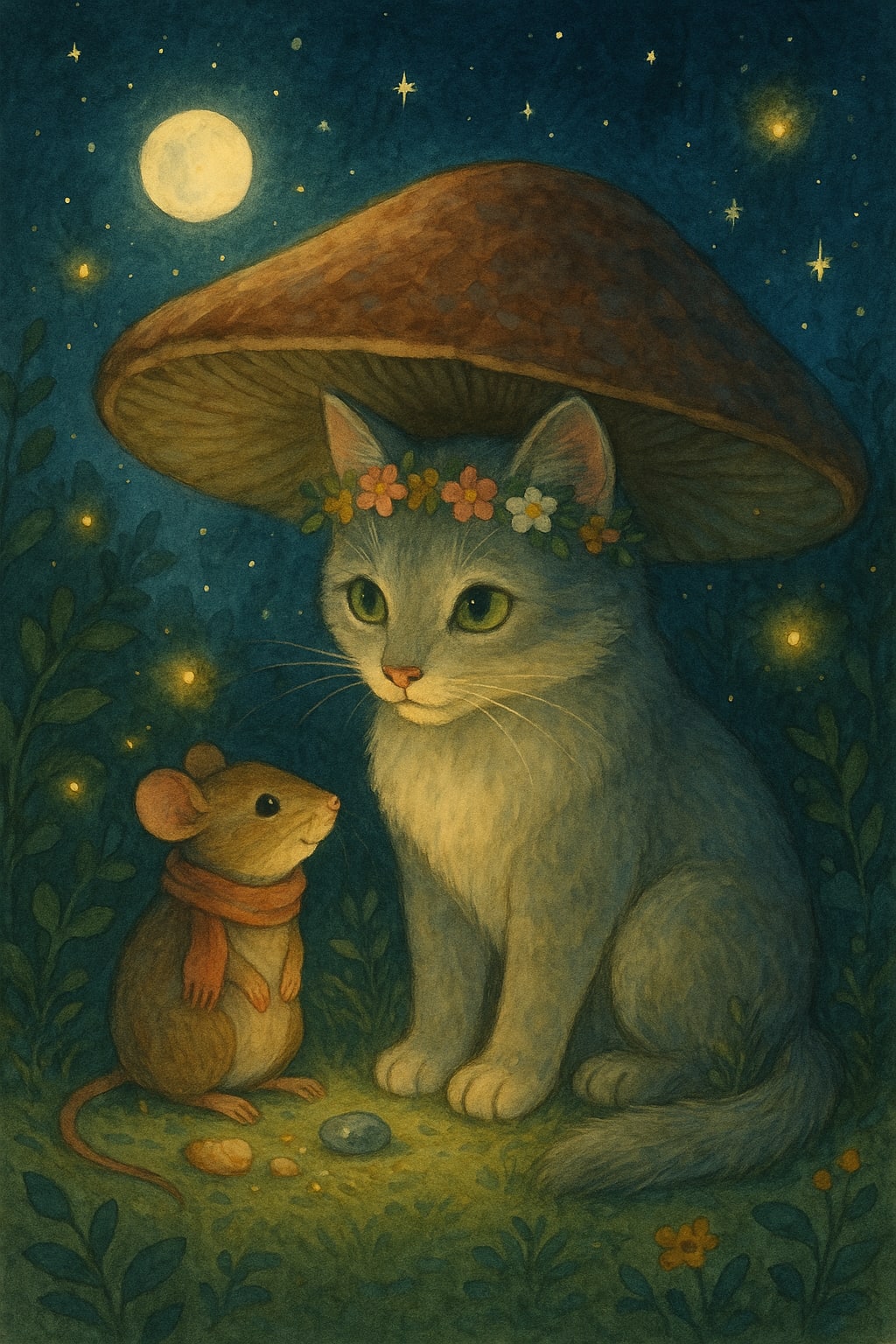 On the fourth night, Crumbs snuck into the garden, carrying a tiny flower crown she’d made from dandelions. She left it by the window. When morning came, Whiskers saw it. His heart swelled.