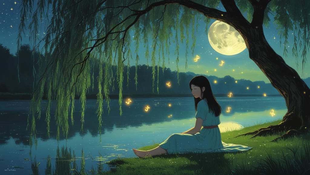 Lina often came here at night, when the world was quiet and her thoughts loud. Sitting beneath the willow’s sweeping arms, she felt a calm she never found anywhere else. The stars above twinkled softly, and the fireflies danced like tiny lanterns guiding her heart.