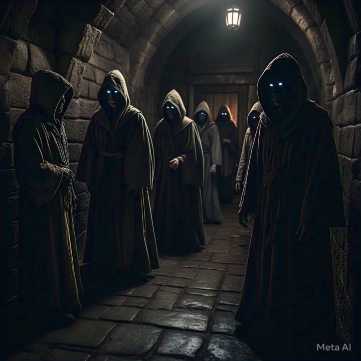 The figure led them through a long hallway, the walls lined with dimly lit torches. At the end of the hall, they entered a large chamber, where several other figures stood, their faces hidden beneath hoods. They were all dressed in similar cloaks, their eyes glowing with an unsettling intensity.