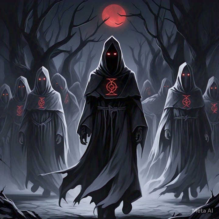 From the distance, a group of cloaked figures emerged, moving with eerie precision. They walked in perfect formation, their heads down, their steps synchronized. Their robes billowed in the breeze, the symbols of the Ananouki visible on their hems.
