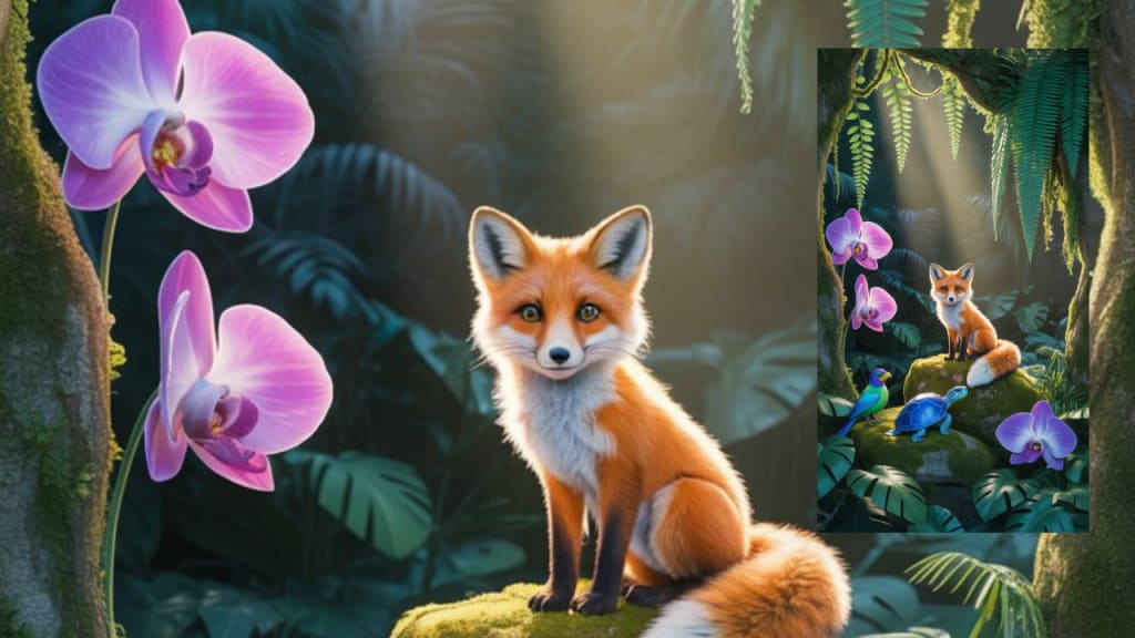 In the heart of the ancient jungle where orchids glowed like lanterns and sunlight poured like golden rain, lived a young fox named Luma. She wasn’t the fastest in her litter, nor the bravest—but she was curious, more than any creature in her forest.