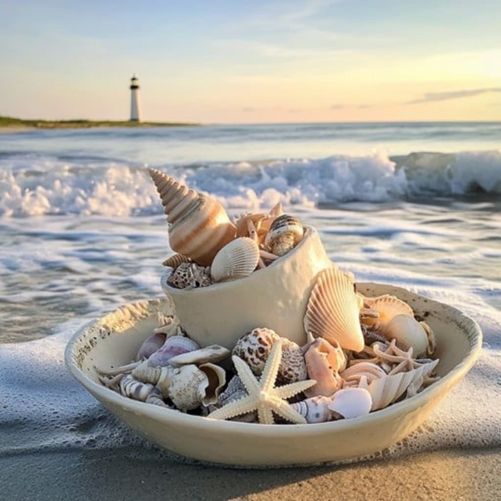 At first glance, the image is simple—serene, even. A ceramic bowl, resting gently on the damp sand, cradles an exquisite collection of seashells. They sit nestled together like quiet thoughts, each one shaped by time and tide. Beyond this peaceful arrangement, the shoreline stretches toward a glowing horizon, golden with the touch of evening light. A lighthouse stands distant and steady, a silent witness to the sea’s ever-shifting moods.
