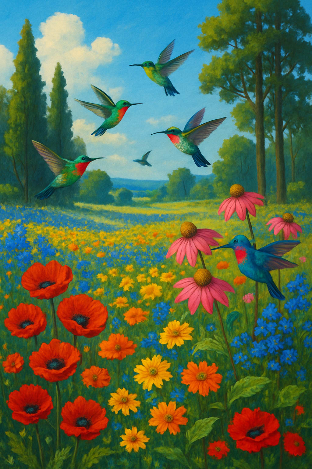 The valley was alive with color. Petals of every hue—red, pink, yellow, blue—swayed in a soft breeze, while tall trees lined the horizon like guardians of a sacred realm. The scent of wildflowers hung in the air, thick with summer’s warmth. Above the blooms, hummingbirds danced, their wings a blur of iridescent green and ruby.