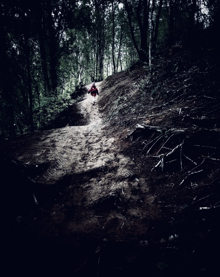 The next morning she looked out her window again and saw the little girl. She was walking along the forset line with the little dog next to her. The same thing happened as the day before. She watched the little girl dissolve into nothing. Instead of being afraid, she was now more curious. That day she stayed in her house. At one point the little dog was barking by her door, but she remained inside. That night she went to sleep in her clothes and placed her shoes by her bed. waking up in the middle of the night, she quickly put on her shoes and quietly ran outside. Walking around the edge of the forest waiting for the little girl to come.