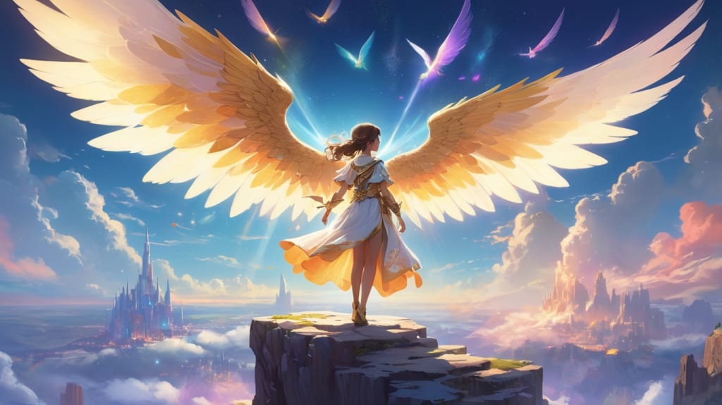 The sunset painted colors in the sky as Lily found herself among many other angels on a puffy white cloud, softly shining with its very own light. An angel looked at her with knowledge shining in his silver wings. "You have a beautiful heart," he said. "Every act of kindness echoes throughout the universe. Your spirit will always carry the light of these moments.". When the morning light crept in, warmth billowed about Lily, and she knew it was time to wake. Reluctantly, she felt herself drawn from the world of dreams-laughter and enjoyment receding like a tune fading into the distance. Then it was that morning sun peeking into her window through her wake-up call when she learned many things that night and took into that new day. From then on, Lily went out seeking every opportunity to help others; to share with one stranger or comfort a troubled friend. She learned she didn't really need wings to be an angel. She would be tangled forever with the magic of her dream, passionately in love, embracing her role in that world. Every little piece of goodness done for anyone was a tiny propeller wing that bade her soar past the ordinary, spreading happiness along the way. With every little thing, Lily found how to shine ever bright, making the mundane turn extraordinary.
