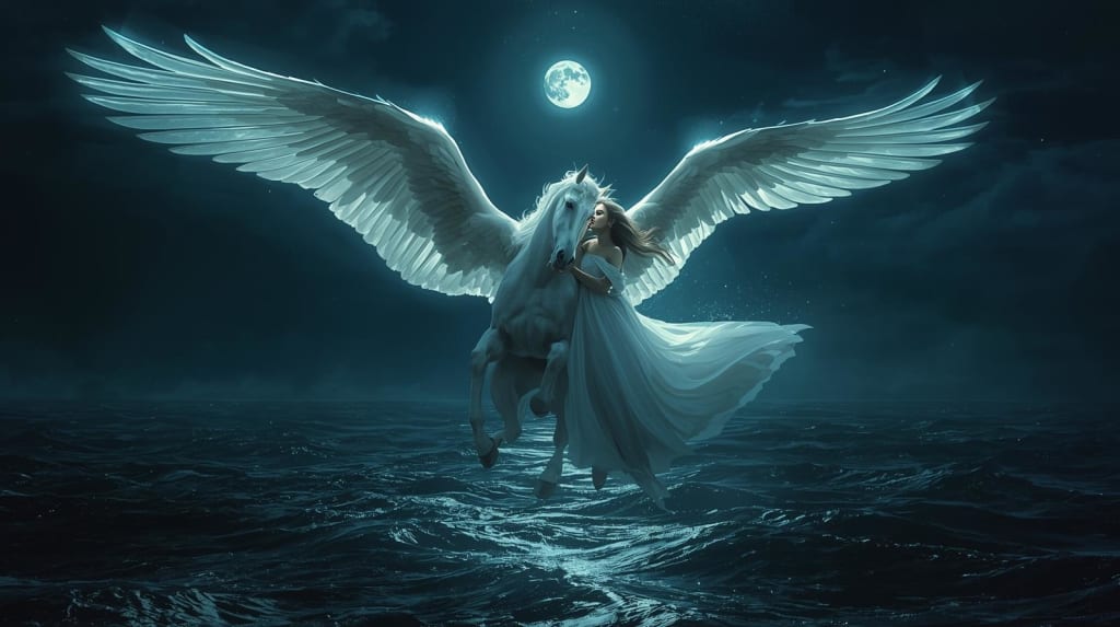 But on nights of the full moon, villagers swore they saw a winged horse gliding above the sea, carrying a young woman in its embrace. Her laughter echoed over the waves. And beside her, the voice of a man answered with endless devotion.