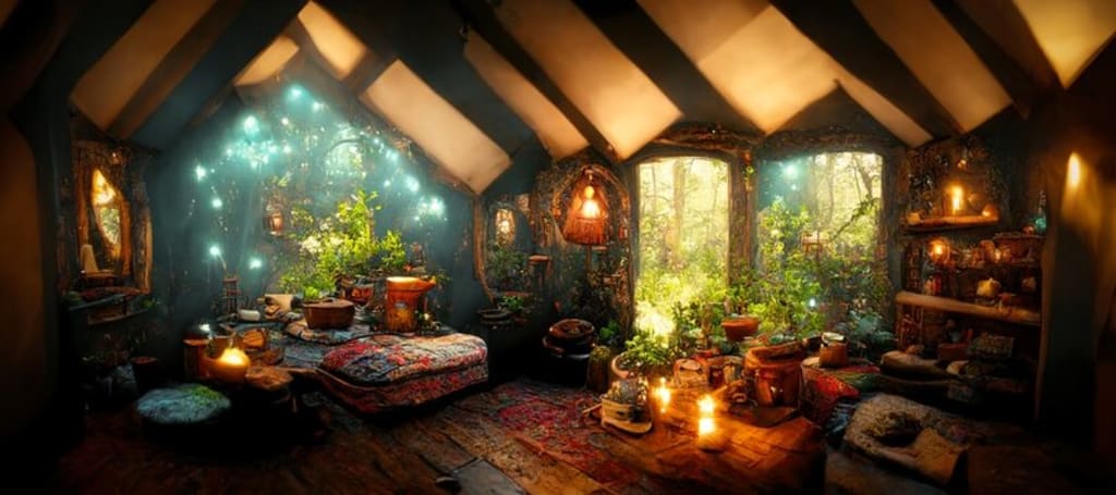 Anyhow, the woman never closes the door day or night. She has plants growing all around the house. Whether they are hanging from the other walls or standing tall from the ground. However, not only on the inside but the outside as well. Plants against the walls and vines wrapping around the house. She painted us a dark brown, and built her own furniture. She placed shelves amongst us, and little charms here and there.