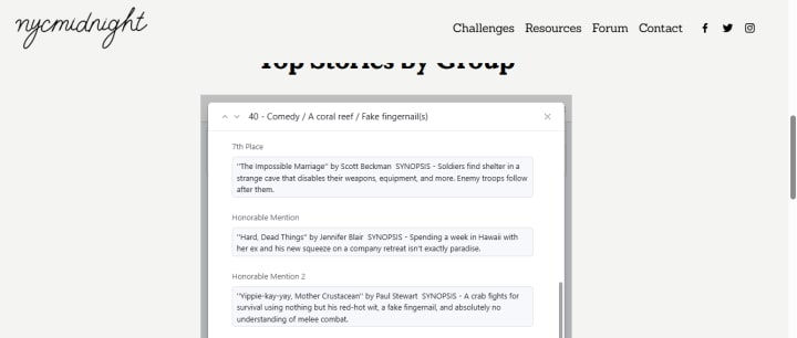 "I threw caution to the wind, if caution was of course me, and the wind was the ocean water surrounding everything I've ever known and tried to swim as fast as I could, sideways like a freak, towards my home." Always love metaphor breakdowns like that. And you certainly checked all the boxes of the prompt elements. Not always easy to blend all those together into a coherent narrative, and the choice of setting was inspired to help emphasize each one. My only suggestion would be to consider the narrative style. Sure, it's a comedy, so tension isn't the first order, but the fight felt a bit muted because we know the narrator has survived because he's recounting the whole thing. Not to mention he himself assures us he's still alive. And obviously this isn't a Thriller, so I don't think we need a true by-the-numbers battle, but tension does help keep the audience's attention. And as I've proven with Martin Williams and now Jason Nightingale, you can have stakes and humor in a confrontation. Often, it's the narrator's glib attitude in the face of danger that lends to the comedy all on its own. Ah, but I just outed this piece of advice as simply another "here's how *I* would have done it" maxim, so take it or leave it.
