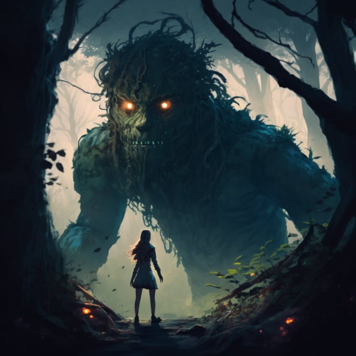 One night, she followed him as he disappeared into the forest. She watched as he transformed into a monster, his eyes glowing red and his fangs bared. She screamed and ran, but he caught her and brought her back to their cottage.