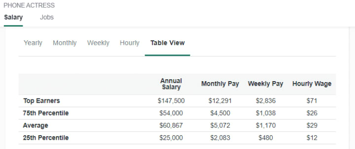 You can see the data above that shows the annual and the monthly salary of the Phone actresses. The Top Phone actresses make over $147,500 a year.