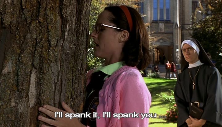 It’s not often that you’ll see a woman French Kiss a hard piece of wood, at least not in a public setting with chirping birds and roaming nuns. This was indeed a real thing that happened in the 1999 Saturday Night Live spin-off that had Molly Shannon talking dirty to an innocent tree. She petted the trunk tenderly and teasingly laughed before the first smooch, only to be interrupted by a snoopy sister. Mary Katherine Gallagher didn’t necessarily save the rain forest, but she brought the house down with this most awkward love scene.
