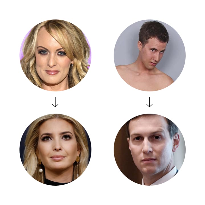 This is a brilliant move in casting the porn parody of the Trump Russia probe if we say so ourselves. One, Jessy Jones can effortlessly look like Jared Kushner; two, Trump allegedly compared Stormy Daniel's appearance to that of his daughter Ivanka. You can see it better when you look at Ivanka Trump and porn star Stormy Daniels' 8 wildest look-alike photos. And even though Daniels told TMZ that she doesn't do parodies, maybe if the right script came along she'd change her mind (just slide into my DMs, porn producers; I will gladly write your movie!)