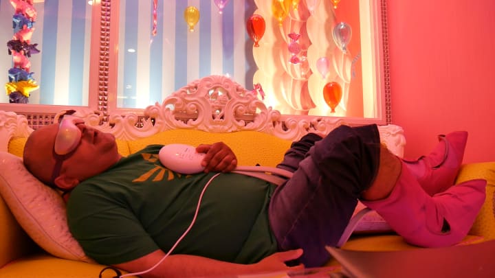 The first thing I did was turn on the mood lighting and music that makes the room, if you can believe it, even pinker.