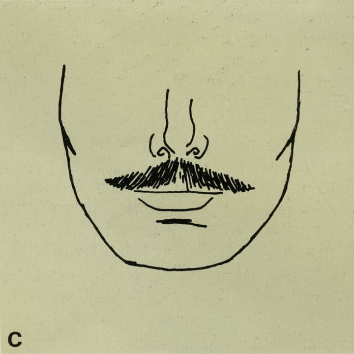This man, too, is substituting for sexual gratification since the brushed and flared ends require such constant attention as stroking. But unlike the "Handlebar" he is an anal erotic precisionist who seeks security through strength. He deliberately endows himself with an aura of authority. His interpersonal relationships are based on an "eye for an eye" philosophy. You invite him to dinner because you like his company. He invites you to his house because he "owes" you a meal. Should he be "delayed" by a refusal for a young lady, he would see it as an obstacle to be circumvented by switching to another topic or activity until he can maneuver around the objection.