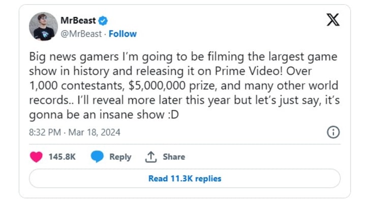 In March, it was announced that Donaldson had secured a deal with Amazon MGM to produce a competition show. While the details about the production were sparse, the announcement revealed that 1,000 contestants would be vying for a prize of $5 million—the biggest in television history.