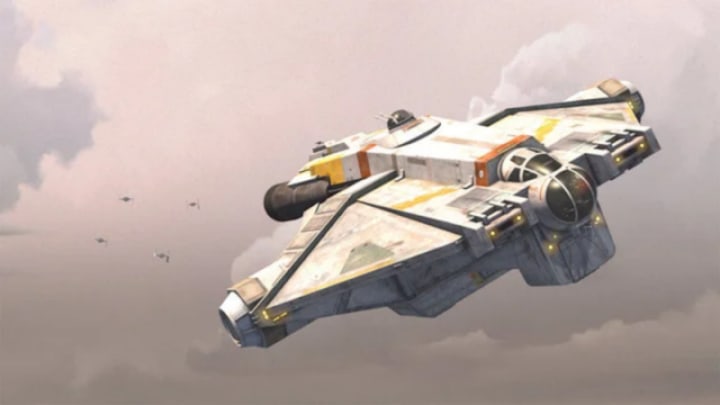 The heavily modified light freighter belonging to Hera Syndulla is used extensively by the Specters rebel cell. Its energy dampeners and static jammers on the engines, among other illegal upgrades, allow the ship to mimic solar fluctuations or cosmic radiation on many sensors. Its weaponry system consisting of multiple laser cannon turrets and a pair of proton torpedo launchers allow it to bring down even an Imperial light cruiser. A smaller auxiliary vessel called the Phantom can be deployed from the Ghost and used as a starfighter or shuttle.