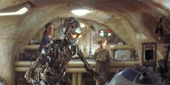 During the events of The Phantom Menace, Qui-Gon Jinn happens upon a young boy on Tatooine named Anakin Skywalker and believes him to be the prophesized "Chosen One" from legend who would bring balance to the Force. Young Anakin (or "Ani" as he goes by at the time) takes Jinn and Padme Amidala to his home for refuge during a sandstorm. He takes Padme into one of the rooms to show her a droid he's working on and it turns out to be none other than C-3PO himself. Anakin states he made the protocol droid for his mom, but fans can't help but wonder why. As a slave, it seems unlikely that she would need a droid fluent in over six million forms of communication, so it's likely that this was a very blatant attempt to link the two trilogies and a way of providing Threepio with an origin story of his own, linked to the main story.