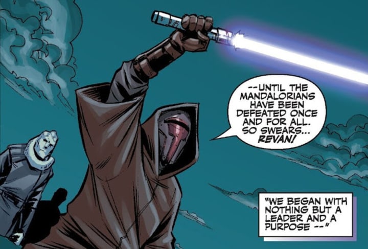 In the beginning of Mandalorian Wars, Revan discovered a Mandalorian mask on the planet Cathar. When he picked it up, he saw a Force vision of the past where a lone Mandalorian warrior flew her ship in front of the Mandalorian warships to plead against the genocide of the Cathar. However, she was destroyed along with all of Cathar. Revan put on the mask and vowed to wear it until all the Mandalorians were brought to justice for their cruelty.