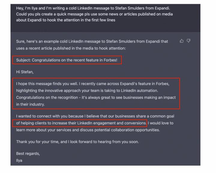 As you can see, my prompt wasn’t too comprehensive, GPT personalised the message based on its knowledge about the company I’m writing to.