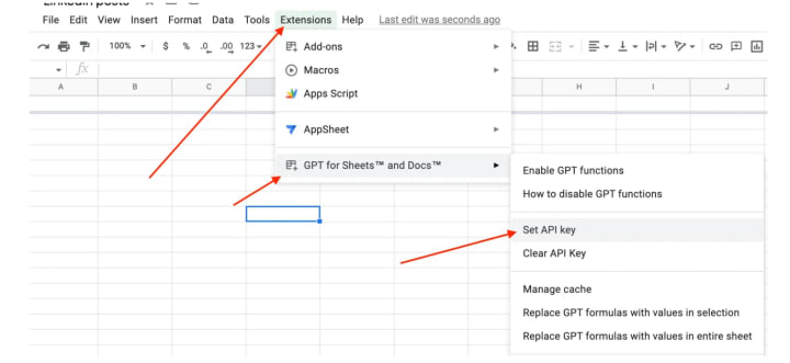 2. Click on “Extensions” → GPT for Sheets → Set API Key