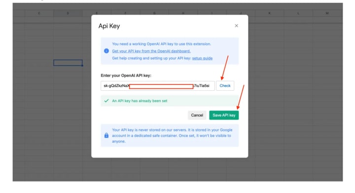 5. Get back to Google Sheets, put your API key and click on “Save API key: