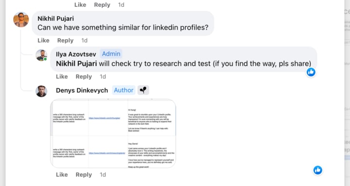 In the ChatGPT Growth Hackers community, Denys Dinkevych shared his approach to personalise LinkedIn/Email messages based on a Github profile: