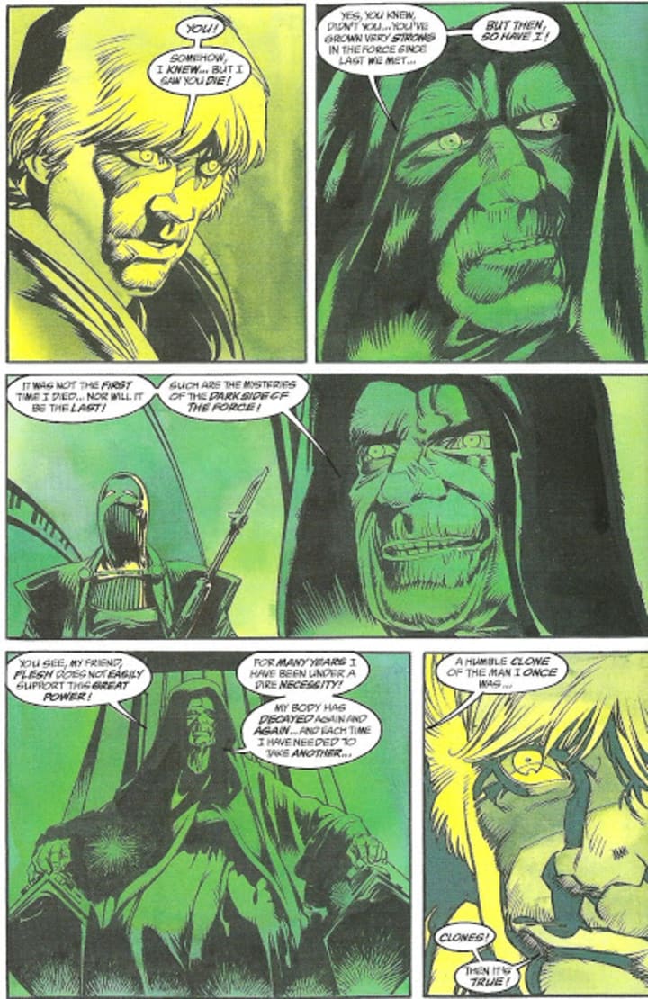 The dark side of the Force is a pathway to many abilities some consider to be unnatural. So much so that both in Legends and Canon, the dark side was able to allow Emperor Palpatine to return from the dead after the Battle of the Endor. The first time, it was in Dark Horse's first story with the license, Dark Empire, where the Emperor returns a few years after the battle of Endor in a clone body to fight Luke, Han, and Leia once again, and reconquer the galaxy in the name of the dark side. While not as popular as other EU stories at the time, the idea of the Emperor's return had staying power.