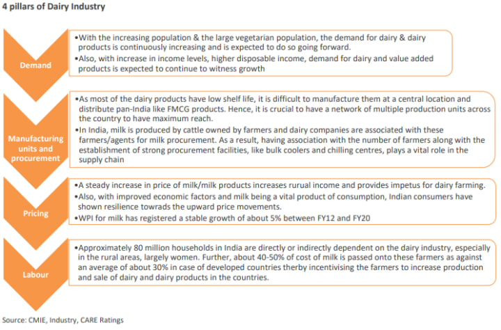Animal husbandry is one of the most lucrative and demanding businesses not only in India but across the globe. The livestock sector - within it, dairy - needs to play a larger role in the prime minister's goal to double the farmer's income by FY23. Dairy farming in India contributes to 4% of its GDP. CARE Ratings estimates milk production to have increased by about 3.9% in FY20 to reach 195 million tonnes. Also, between FY19 and FY23, milk production is expected to increase at about 4.8% CAGR to reach 226 million tonnes by FY23 while the per capita availability is expected to witness a CAGR of about 4.6% during the period to cross 470 grams per day by FY23. India has also retained the leadership position in milk production by producing 188 mn tonnes in FY19; accounting for about 22% of global milk production. Hence, dairy industry has played a crucial role in the agro-based Indian economy[CARE Rating].